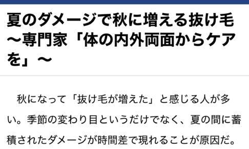 時事メディカル様にて取材協力・記事監修をさせていただきました。 今回は「年間で最も抜け毛が増える季節・秋」にフォーカスし、【抜け毛が増える原因】と【今すぐできる対策法】についてお伝えしています。 「最近抜け毛が気になる……