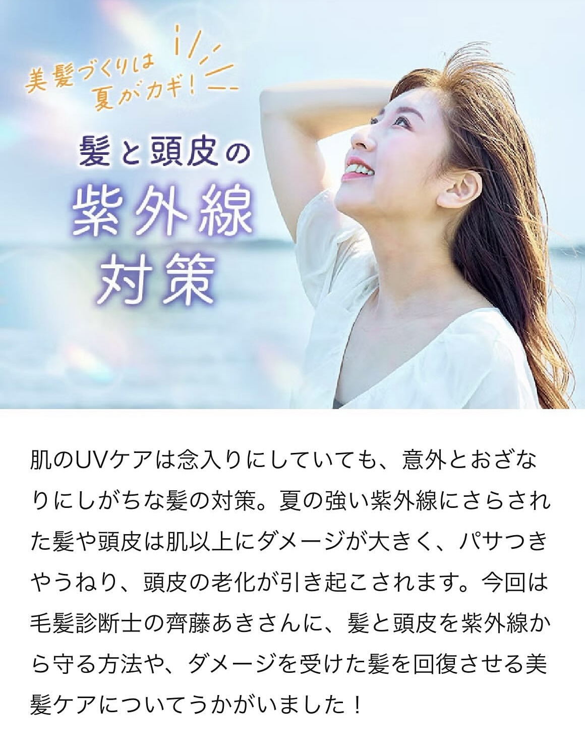 今回は「髪と頭皮の紫外線対策」について。紫外線が与える影響や、髪や頭皮を守るメソッド、うるおい&ツヤ回復ケアなどについてお話しています。